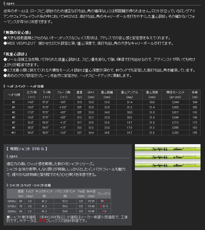 SYB Golf W422V Fairway Wood is a premium line of woods made for forgiveness and distance. It features a traditional head shape with a design to help achieve a high launch to maximize carry. It can easily be used by the average player, but has the shape and performance that can be appreciated by the low cappers.